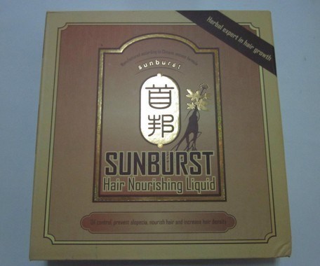 Manufactured according to Chinese ancient formula. SUNBURST hair nourishing liquid is made up of precious herbal medicines according to Chinese ancient formula. It includes ginseng, radix salviae militiorrhizae, angelica sinensis and saline cistanche etc. The production process employs the latest technology to extract essentials from herbs and adopts an up-graded formula to guarantee superior effectiveness.